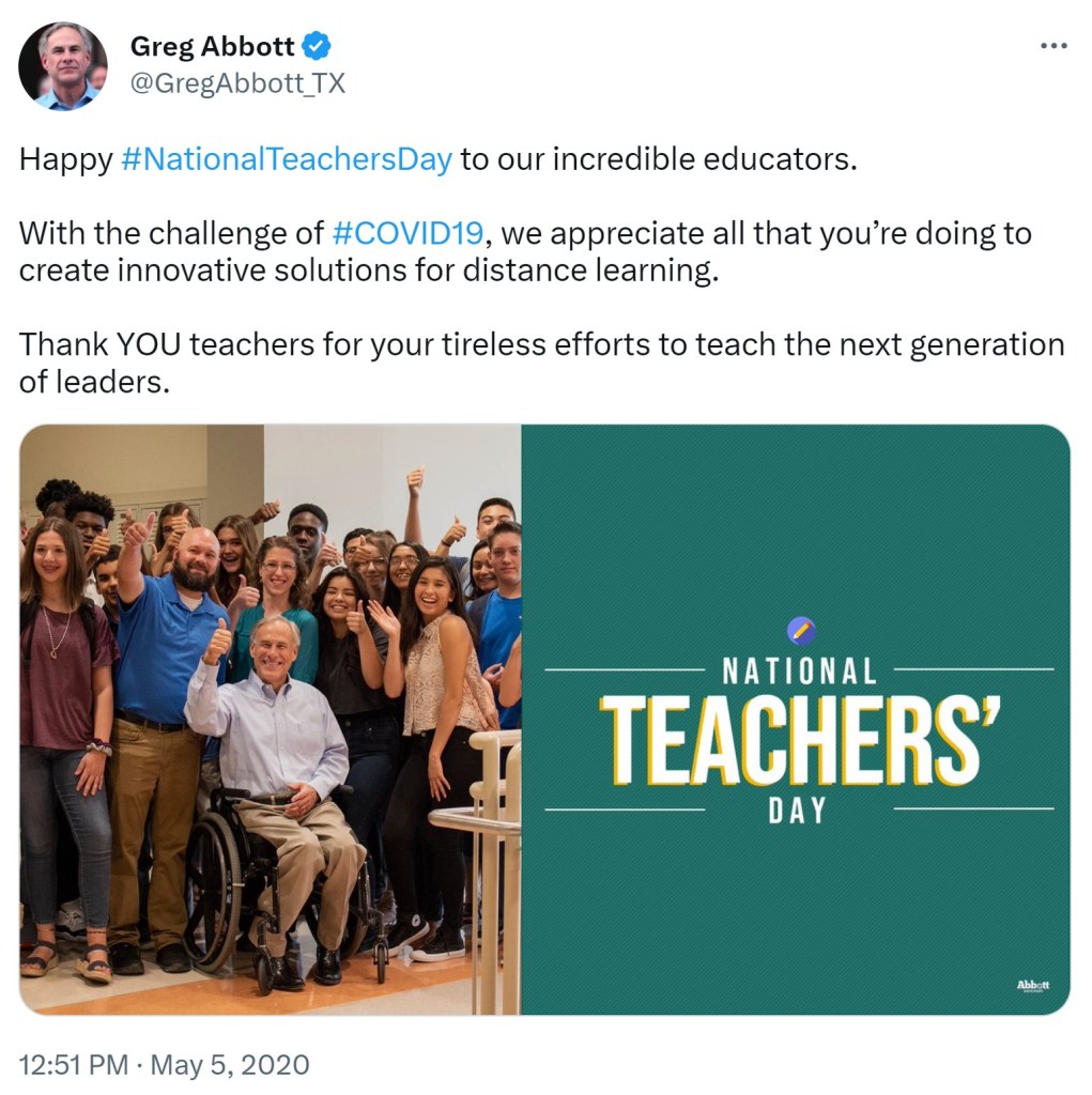 In the horrible early months of the pandemic, Texas public school teachers were hailed as heroes, alongside our peers from across the nation and world. Families had a window into our work as they watched us scramble to teach their children through computer screens. They could see our love for kids and our expertise in action. Texas governor Greg Abbott sang our praises.